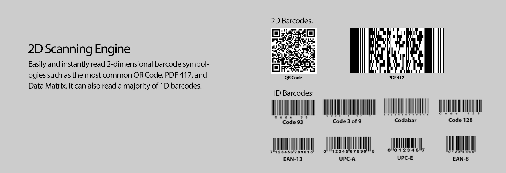 - Capture both 1D and 2D barcodes from a paper, synthetic media, and electronic screens.