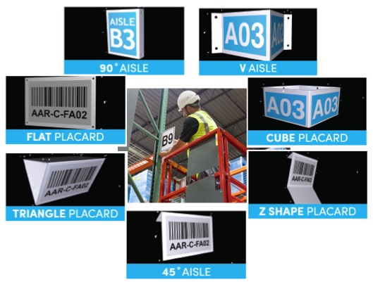 Popular sign and placard types include:  45 degree Aisle, 90 degree Aisle, V Aisle, Cube Placard, Flat Placard, Triangle Placard, and Z Shape Placard.
